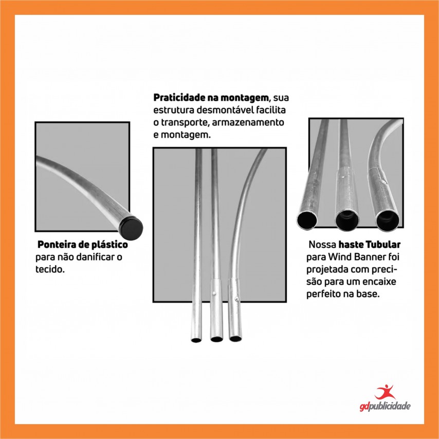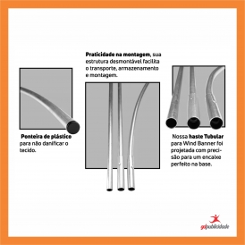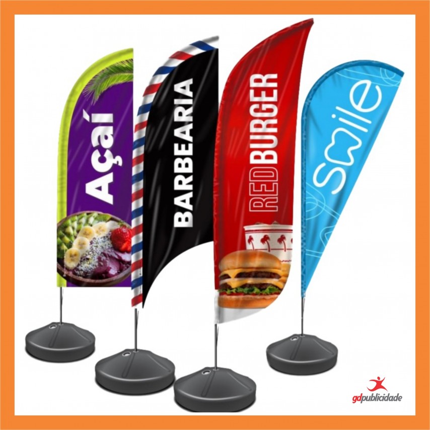 O Wind Banner padrão da GD Publicidade é produzido em tecido flag 100% poliéster, incluso apenas a bandeira e a vareta em tubo metálico. Ideal para ser utilizado na porta de estabelecimentos e comércios que desejam destacar seus produtos, promoções, contatos e a própria marca, chamando a atenção do público ao se deparar com o movimento gerado pelo vento. Disponível também opcional de base de plástico resistente.
